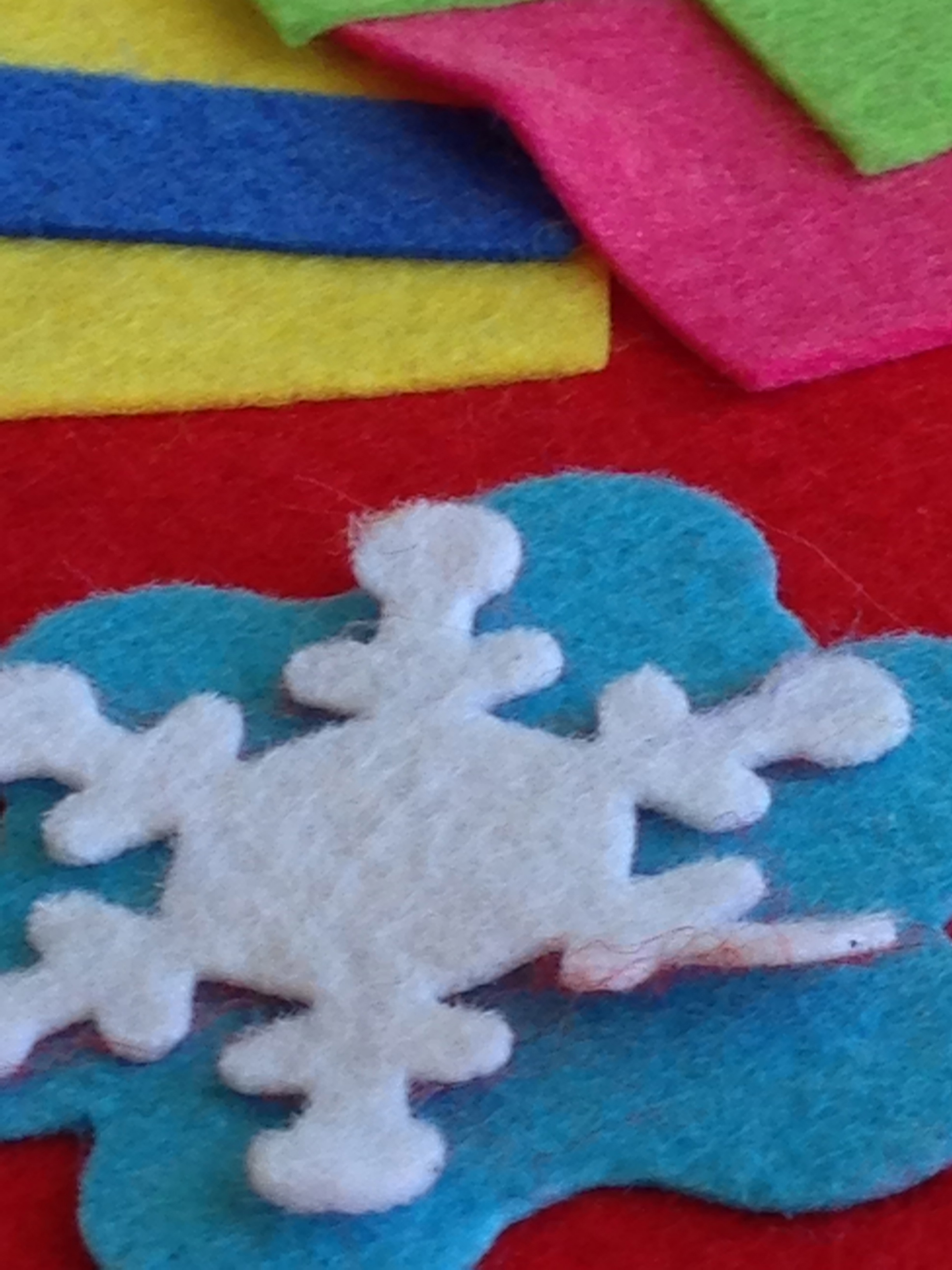 Then, he was ready to move on to something else, and we set the materials aside to finish later. He pulled the whole assembly out several times over the next two days, each time for shorter sessions, and each time, leaving ever-increasing piles of felt stickers and scraps in his wake.